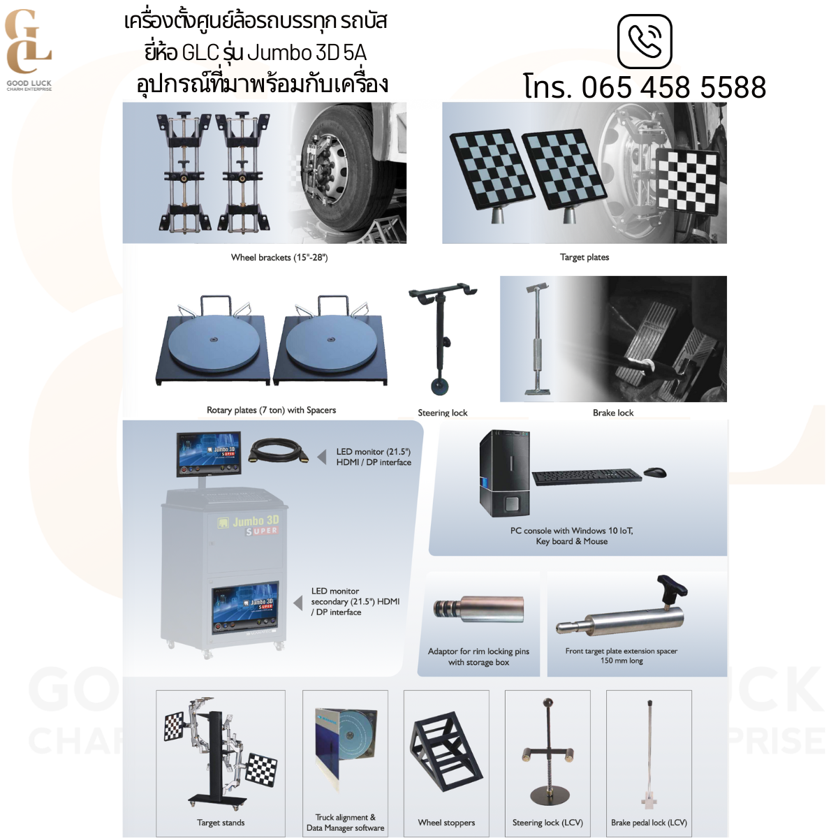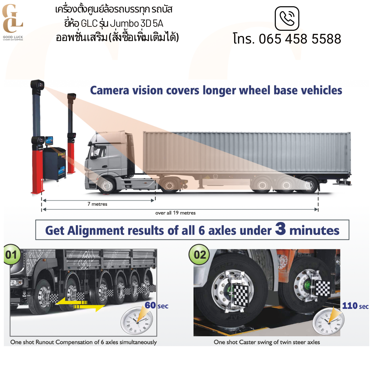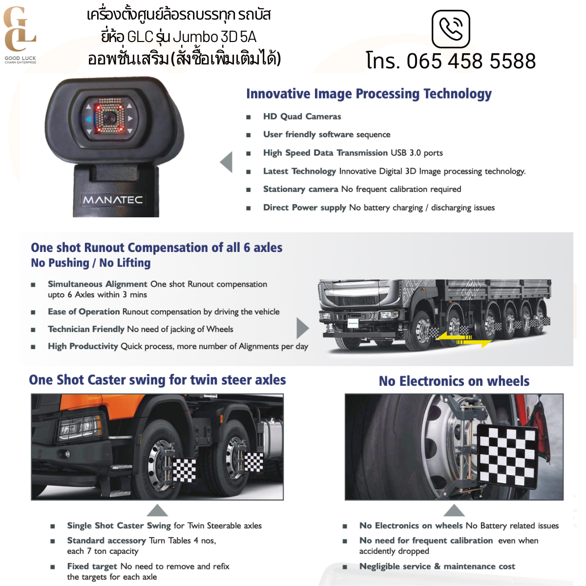 ยี่ห้อ GLC รุ่น Jumbo (5A) ผลิตโดย Manatech ประเทศอินเดีย เป็นโรงงานชั้นนำระดับโลก และได้รับรางวัลจาก Automechanika ในส่วนของผู้พัฒนานวัตกรรมตั้งศูนย์ระบบ 3D สำหรับรถเพื่อการพาณิชย์