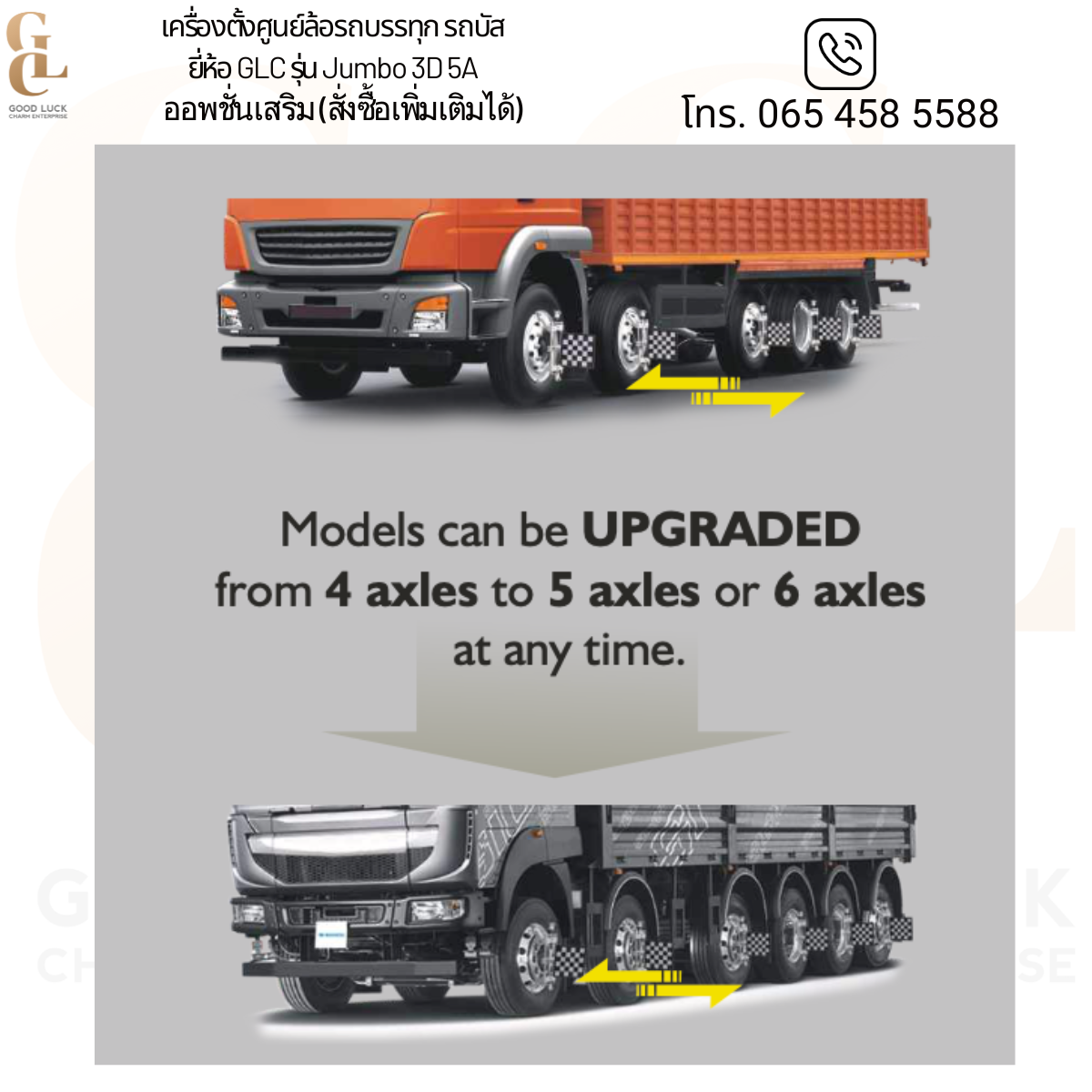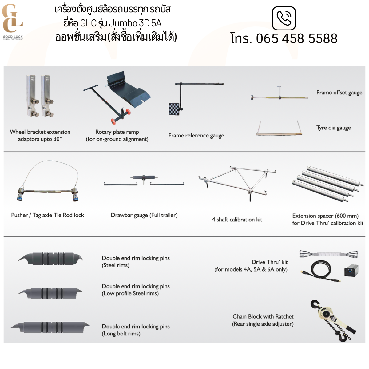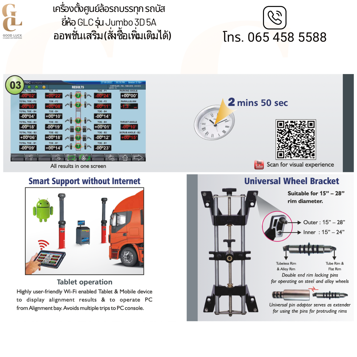 ยี่ห้อ GLC รุ่น Jumbo (5A) ผลิตโดย Manatech ประเทศอินเดีย เป็นโรงงานชั้นนำระดับโลก และได้รับรางวัลจาก Automechanika ในส่วนของผู้พัฒนานวัตกรรมตั้งศูนย์ระบบ 3D สำหรับรถเพื่อการพาณิชย์